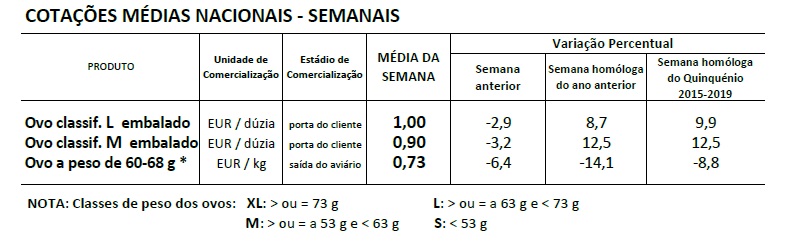 Na semana em análise deu-se uma redução generalizada das cotações médias nacionais dos ovos em relação à semana anterior, -5 cêntimos / kg para o ovo na produção (ovo a peso de 60 a 68 g) e -3 cêntimos / dúzia no caso dos ovos classificados e embalados em ovotermo das classes de peso M e L.