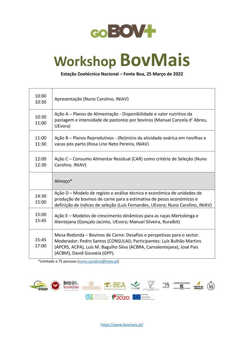 No próximo dia 25 de Março, realizar-se-á na Estação Zootécnica Nacional, em Santarém, o “Workshop Bovmais” organizado pelo Grupo Operacional BovMais.