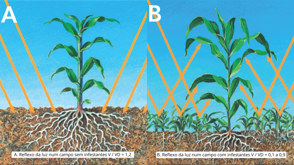 Nas folhas do milho são os recetores de luz (fitocromos) que detetam as mudanças na luz. Quando as infestantes emergem ao mesmo tempo que a cultura, os fitocromos contidos nas células das plantas do milho identificam a categoria particular de frequências de luz refletida pelas infestantes, levando as plantas do milho a adotar uma estratégia de crescimento para evitar a sombra, emitindo um caule mais alto e folhas maiores.