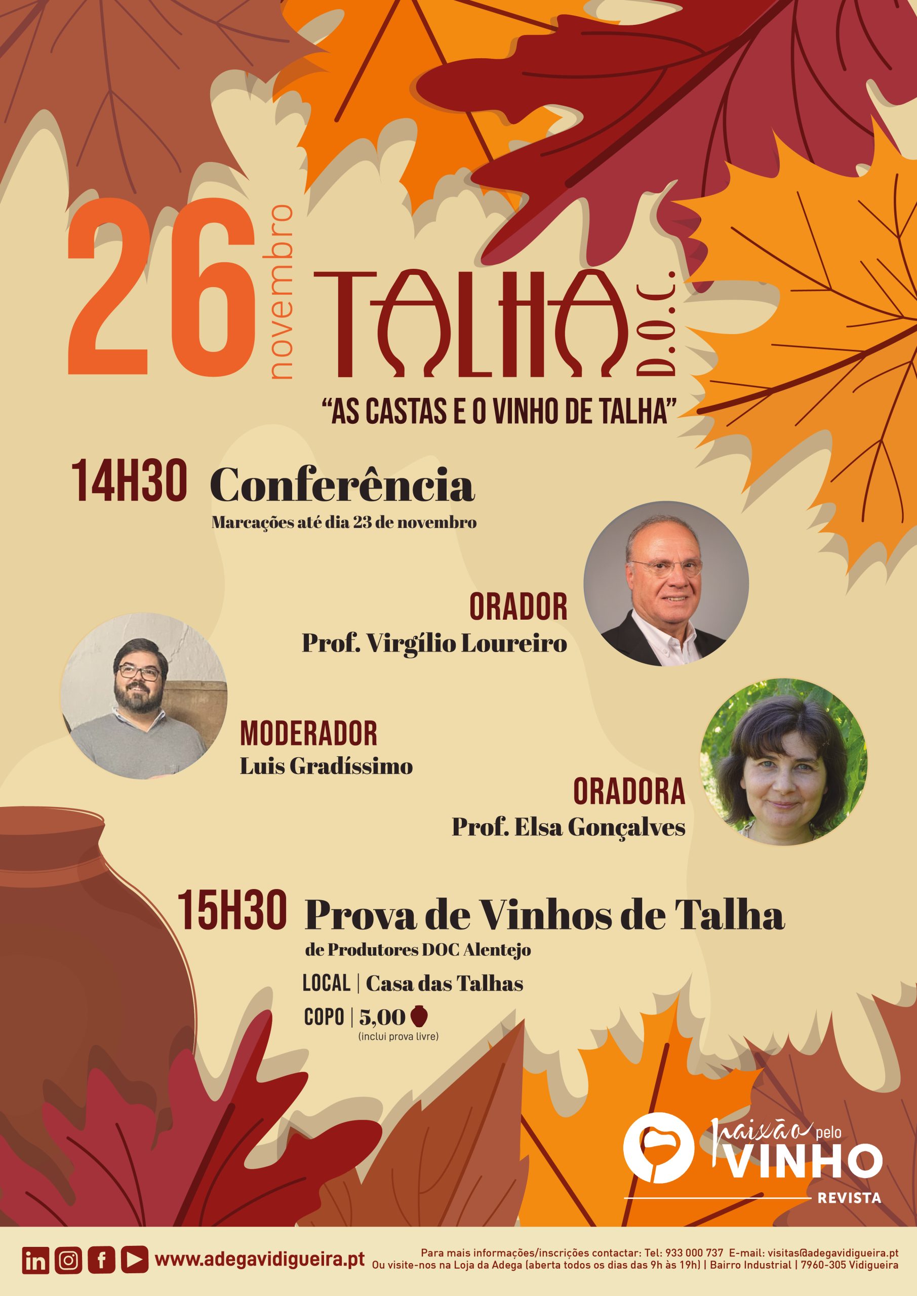 Depois de dois anos parado, o TALHA DOC regressa com uma conferência atual e mais produtores desta técnica milenar. É um evento que pretende preservar e mostrar ao público a essência do Vinho de Talha através da prova de vinhos de diversos Produtores convidados.