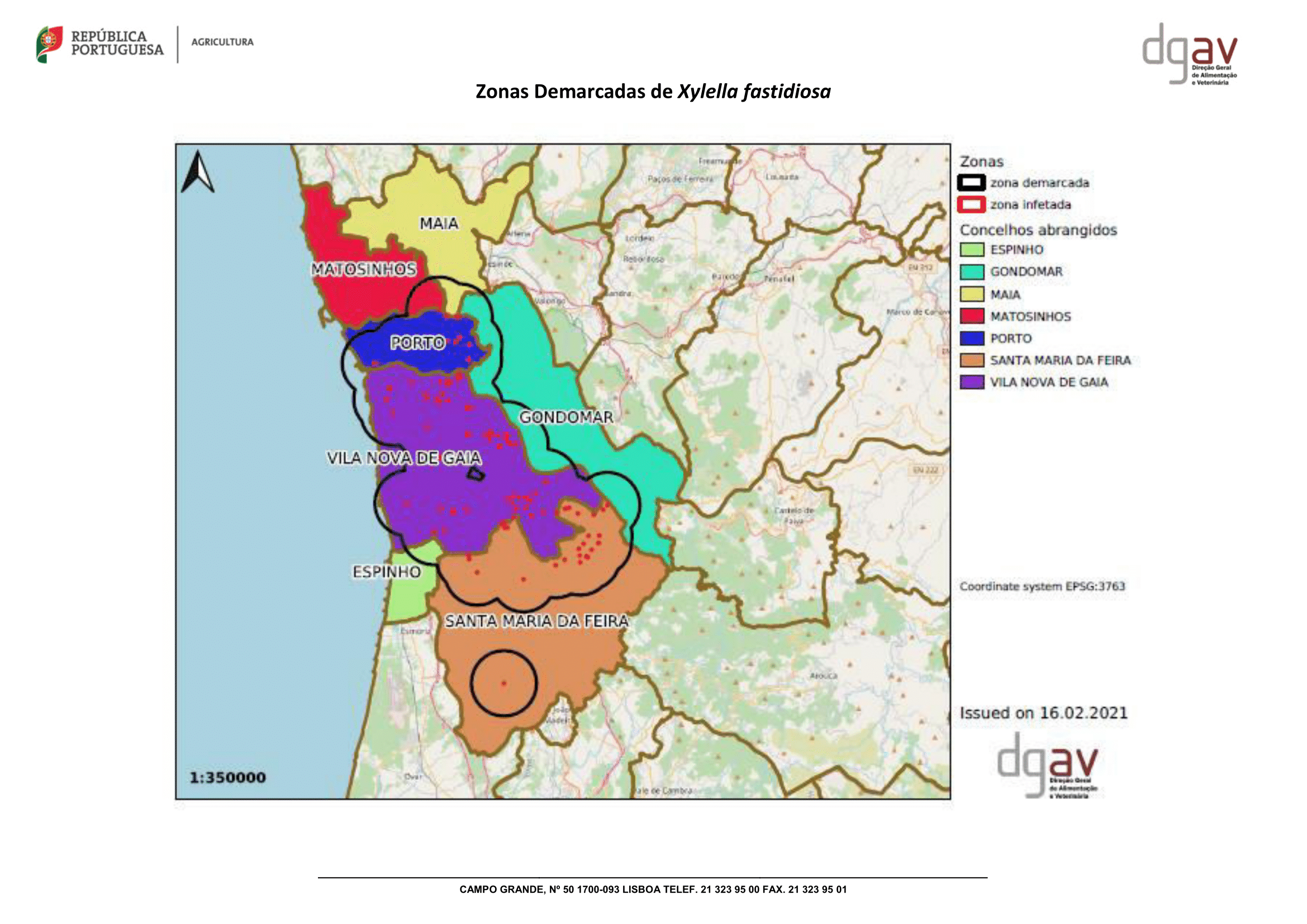a) Procede-se à delimitação da zona demarcada para Xylella fastidiosa, encontrando-se em anexo o respetivo mapa, bem como, a lista das freguesias total ou parcialmente abrangidas por esta zona demarcada, também disponível na página electrónica da DGAV1;