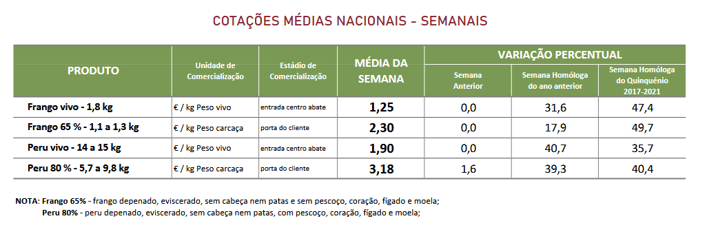 Na semana em análise registou–se novamente um ligeiro acréscimo da cotação média nacional do peru abatido (80% – de 5,7 a 9,8 kg) em relação à semana anterior (+5 cêntimos / kg). Estabilidade das cotações médias nacionais do frango vivo (de 1,8 kg), do frango abatido (65% – de 1100 a 1300 g) e do peru vivo (de 14 a 15 kg).