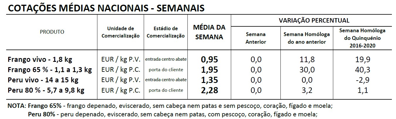 Na semana em análise as cotações médias nacionais do frango vivo (de 1,8 kg) e abatido (65% – de 1100 a 1300 g) e do peru vivo (de 14 a 15 kg) e abatido (80% – de 5,7 a 9,8 kg) mantiveram-se estáveis em relação à semana anterior.