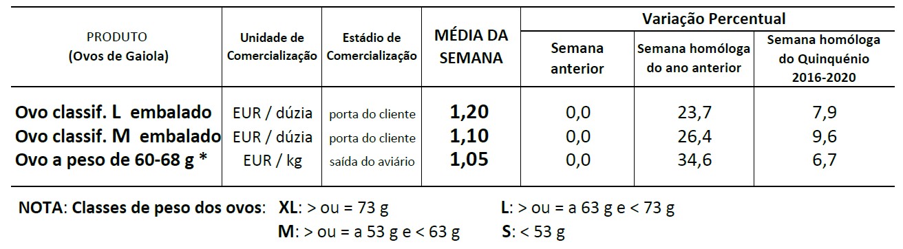Na semana em análise as cotações médias nacionais dos ovos, na produção (ovo a peso de 60 a 68 g) e classificados e embalados em ovotermo das classes de peso M e L, mantiveram-se estáveis em relação à semana anterior.