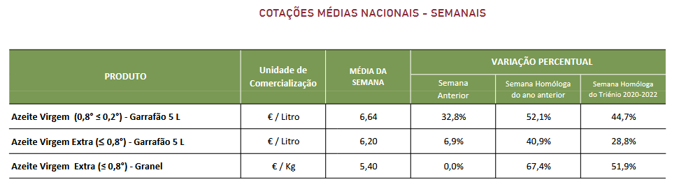 Iniciou a campanha de comercialização de Azeite 2022/ 23 na área de mercado Alentejo Sul, Beira Interior e Trás-os-Montes e prosseguiu nas áreas de mercado Alentejo Central, Alentejo Norte, Ribatejo e Beira Litoral. O produto classifica-se como bom em relação à qualidade, excepto nos mercados da Beira Litoral e da Beira Interior que apresentam qualidade média devido a problemas fitossanitários. Nas áreas de mercado do Alentejo e Trás-os-Montes registaram-se cotações superiores às verificadas na campanha anterior. Devido ao ano contrassafra e às condições meteorológicas adversas, prevêem-se quebras na produção em comparação com a campanha anterior.