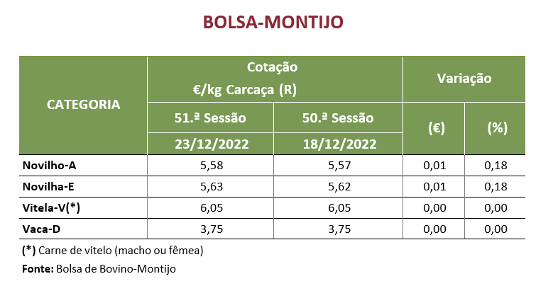As cotações médias, de novilhas e de novilhos, 12 a 24 meses, cruzados Charolês aumentaram, 0,017 €/kg C e 0,013 €/kg C, respetivamente. As cotações médias, de novilhas e de novilhos, 12 a 24 meses, Turina, não se alteraram.