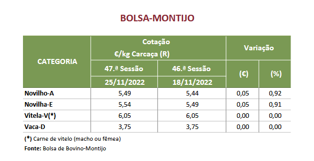 Na Região: a cotação, mínima, de vaca abate, cruzada Charolês, aumentou 0,50 €/kg C, mas a cotação máxima diminuiu 0,10 €/kg C; as cotações, mínima e máxima, de vitelo macho, 6 a 8 meses, cruzado Charolês, aumentaram, 0,35 €/kg V e 0,10 €/kg V, respetivamente, mas a cotação mais frequente, diminuiu 0,03 €/kg V; as cotações, máxima e mais frequente, de vitelo macho, 8 a 12 meses, cruzado Charolês, diminuíram, 310,00 €/U e 157,00 €/U, respetivamente, mas a cotação mínima aumentou 93,00 €/U.