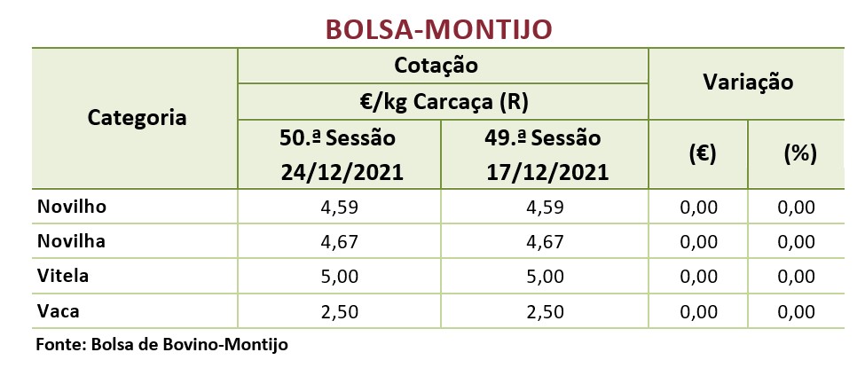 A cotação média de novilho, 12 a 24 meses, cruzado Charolês, aumentou, 0,063 €/kg Carcaça, mas a de novilha da mesma raça, aumentou 0,083 €/kg Carcaça. As cotações médias, de novilhas e de novilhos, 12 a 24 meses, Turina, não se alteraram.