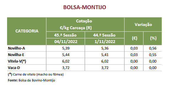 Na área de mercado, Guarda, as cotações, mínima, máxima e mais frequente, de novilho, 12 a 24 meses, Turina, aumentaram 0,05 €/kg C; as cotações, mínima e mais frequente, de novilha, 12 a 24 meses, Turina, aumentaram 0,05 €/kg C; a cotação mínima, de novilho, 12 a 24 meses, cruzado Charolês, aumentou 0,05€/kg C e a cotação mais frequente aumentou 0,10 €/kg C.