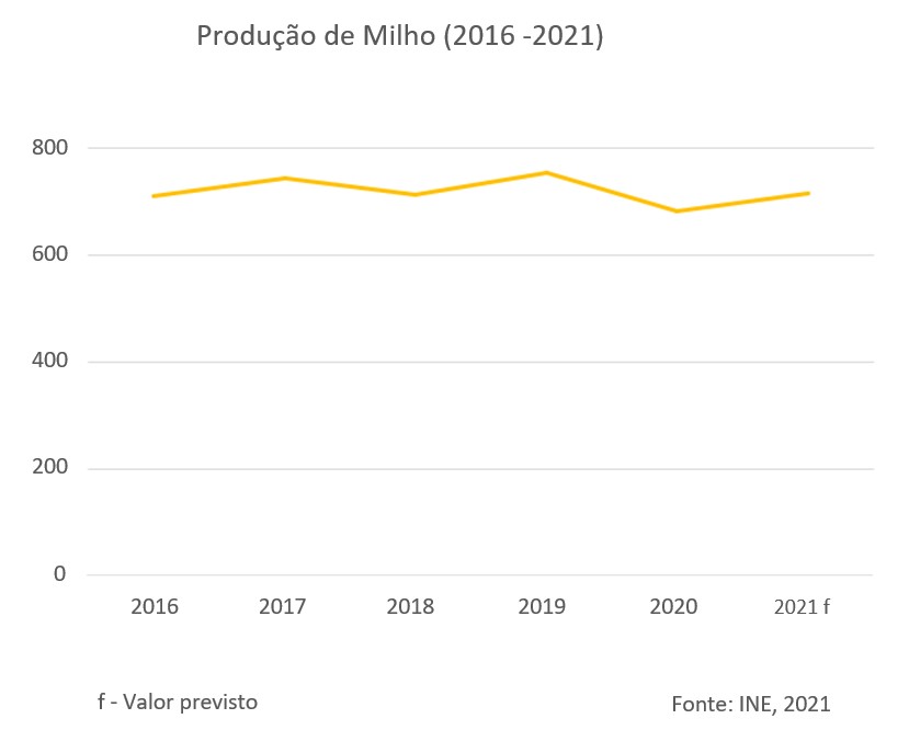O INE prevê que a produção global de milho, de regadio e de sequeiro, alcance 716 mil toneladas valor 5% acima do registado na última campanha e próximo da média do último quinquénio.
