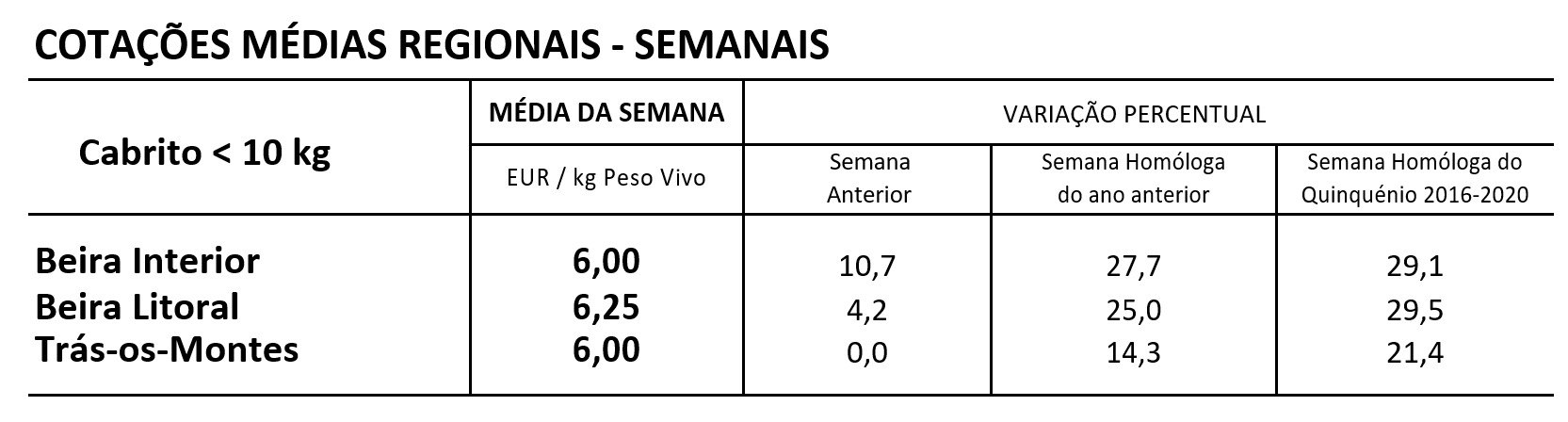 Na semana em análise as cotações médias dos cabritos de <10 kg aumentaram em relação à semana anterior nas regiões da Beira Interior (+58 cêntimos / kg) e da Beira Litoral (+25 cêntimos / kg); estabilidade destes animais em Trás-os-Montes.