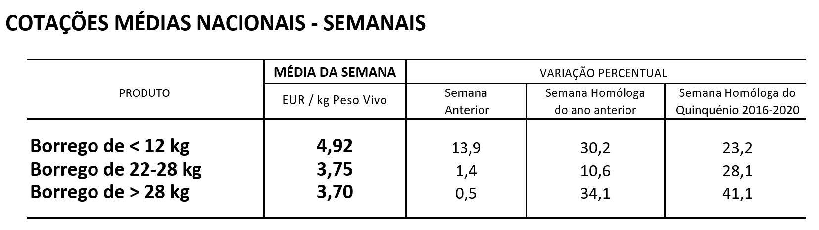 Na semana em análise registou-se uma subida generalizada das cotações médias nacionais dos borregos analisados em relação à semana anterior: +60 cêntimos / kg para os animais de <12 kg, +5 cêntimos / kg para os de 22-28 kg e +2 cêntimos / kg no caso dos >28 kg.