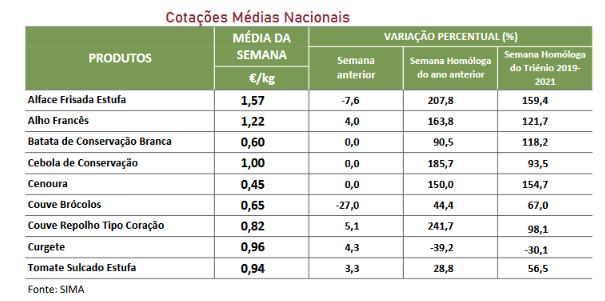 Na região da Beira Litoral, área de mercado Beira Litoral, continuou a registar-se grande perda de produção e de qualidade em todas as variedades de brássicas devido a doenças abióticas. A couve “Brócolos” e a couve-flor não tiveram transações nesta semana devido à falta de produto. Com menor oferta, as cotações subiram para a couve “Lombardo” em 20%, “Portuguesa” 14% e “Repolho Tipo Coração” 11%. Subida para a curgete em 15%, devido a uma menor oferta e maior procura. A menor oferta e mesmo a menor qualidade do nabo com rama, fizeram subir a sua cotação em 10%.