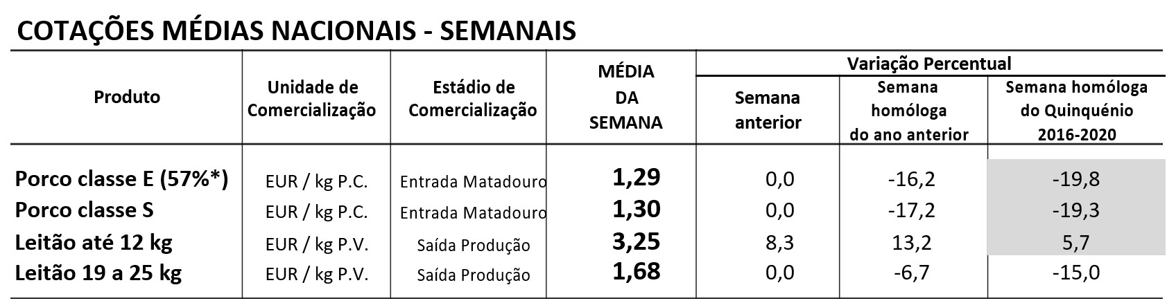 Na semana em análise as cotações médias nacionais dos porcos classe E e classe S mantiveram-se estáveis em relação à semana anterior. No que se refere aos leitões, deu-se uma subida dos leitões de <12 kg (+25 cêntimos / kg), enquanto os de 19-25 kg se pautaram pela estabilidade.