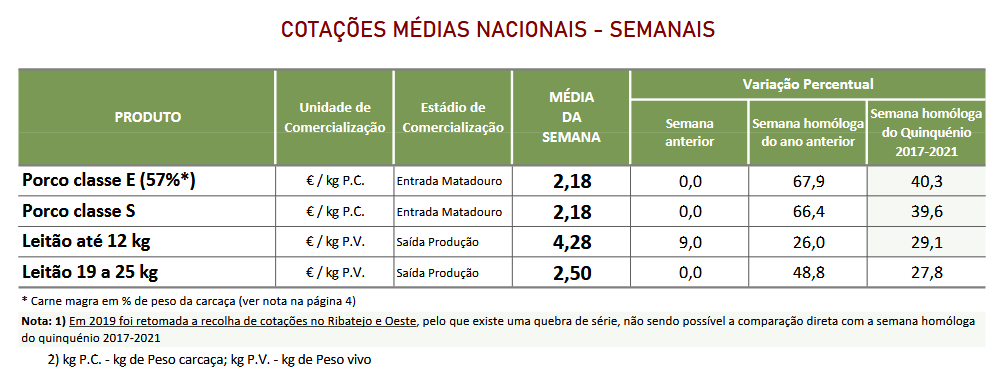 Na semana em análise as cotações médias nacionais dos porcos classe E e classe S mantiveram–se estáveis em relação à semana anterior, pela 3ª semana consecutiva. No caso dos leitões, verificou–se um aumento das cotações dos de <12 kg (+35 cêntimos / kg) e estabilidade dos de 19–25 kg.