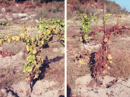 Videira muito afetada (à esq.) e videira morta (à dir.). Fonte: Ficha Técnica Nº 113, DRAEDM, Outubro 2006