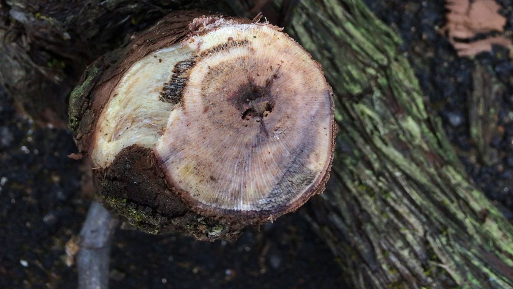 Os sintomas desta doença subdividem-se em primários e secundários. Os primeiros resultam da ação direta do fungo e consistem em necrose setorial castanho-claro e dura em forma de cunha, no tronco ou nos braços atacados. Na Primavera surgem os sintomas secundários nos braços atacados, os lançamentos apresentam um crescimento reduzido, entrenós curtos, folhas pequenas, deformadas cloróticas e com necroses.