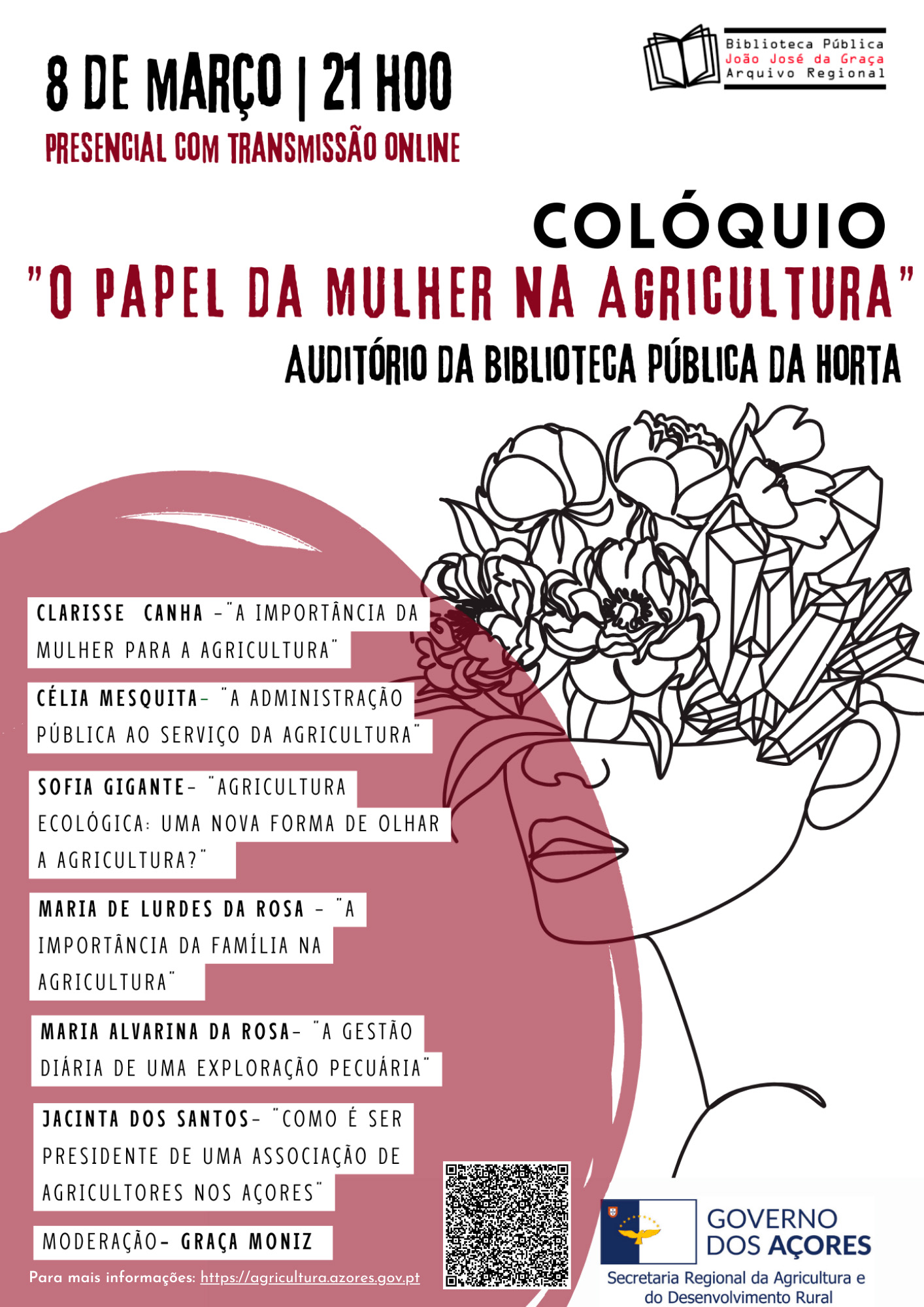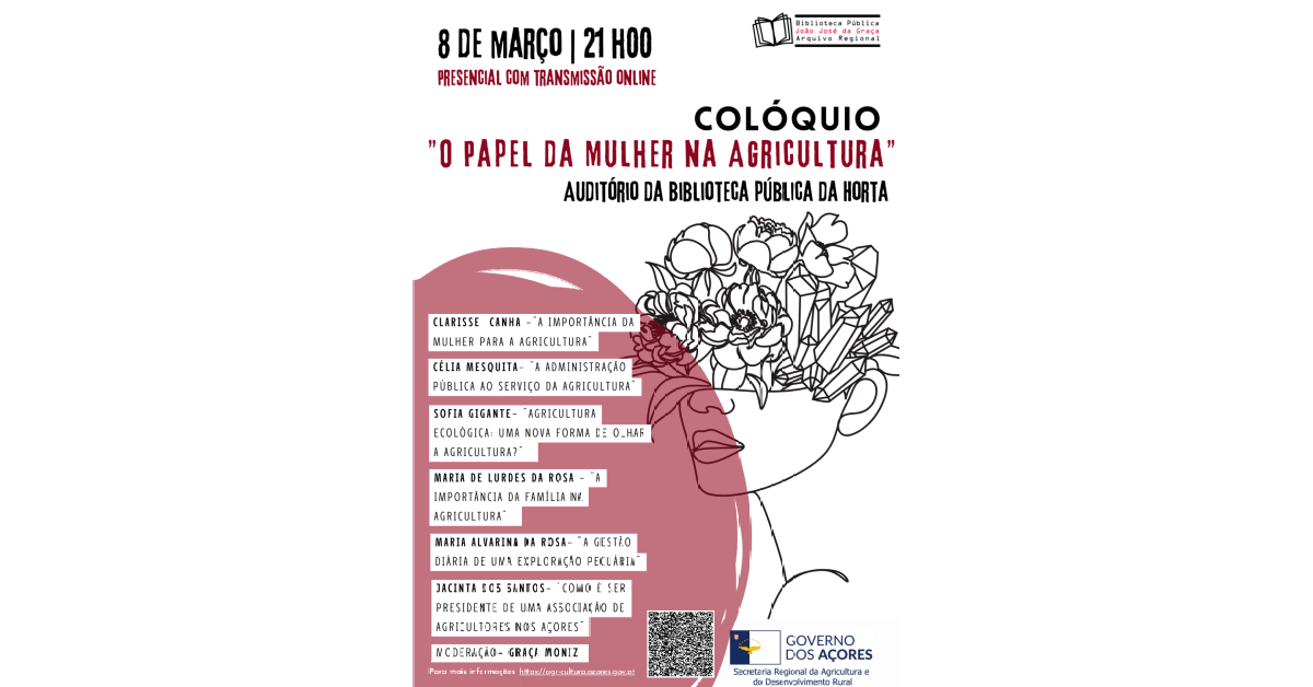 O Governo dos Açores, através da Secretaria Regional da Agricultura e do Desenvolvimento Rural, promove hoje, Dia da Mulher, o colóquio “O Papel da Mulher na Agricultura”, a ter lugar no Auditório da Biblioteca Pública João José Graça, na Horta, às 21h00.