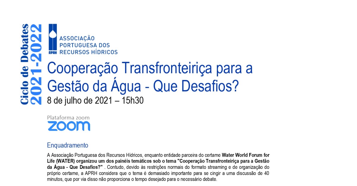 A Associação Portuguesa dos Recursos Hídricos, enquanto entidade parceira do certame Water World Forum for Life (WATER) organizou um dos painéis temáticos sob o tema “Cooperação Transfronteiriça para a Gestão da Água – Que Desafios?” . Contudo, devido às restrições normais do formato streaming e de organização do próprio certame, a APRH considera que o tema é demasiado importante para se cingir a uma discussão de 40 minutos, que por via disso não proporciona o tempo desejado para o necessário debate.