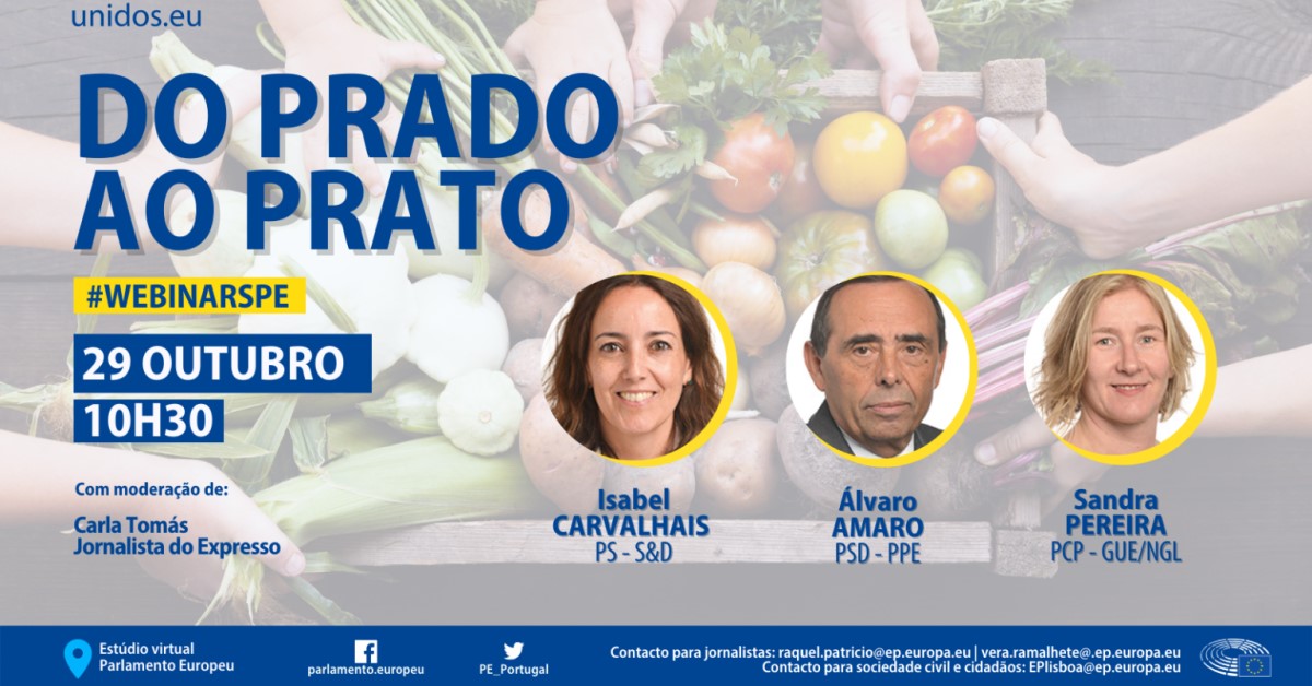 Webinar “Do Prado ao Prato”, com organização do Parlamento europeu, e no qual participam os eurodeputados portugueses: Isabel Carvalhais – PS-S&D; Álvaro Amaro – PSD – PPE, Sandra Pereira – PCP-GUE/NGL e Nuno Melo – CDS-PP – PPE.