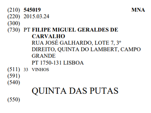 - que sejam contrárias à lei e à ordem pública ou que ofendam a moral e os bons costumes (Exemplo: pedido de registo de marca nacional nº 545 019, recusado, “QUINTA DAS PUTAS”, para identificar vinho);