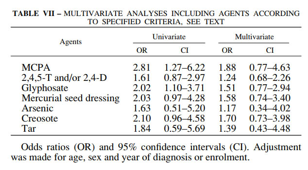 No caso de Eriksson et al. que incluiu apenas 29 casos e 18 controlos na avaliação do glifosato (portanto, um estudo minúsculo), ainda podemos ler no próprio estudo: