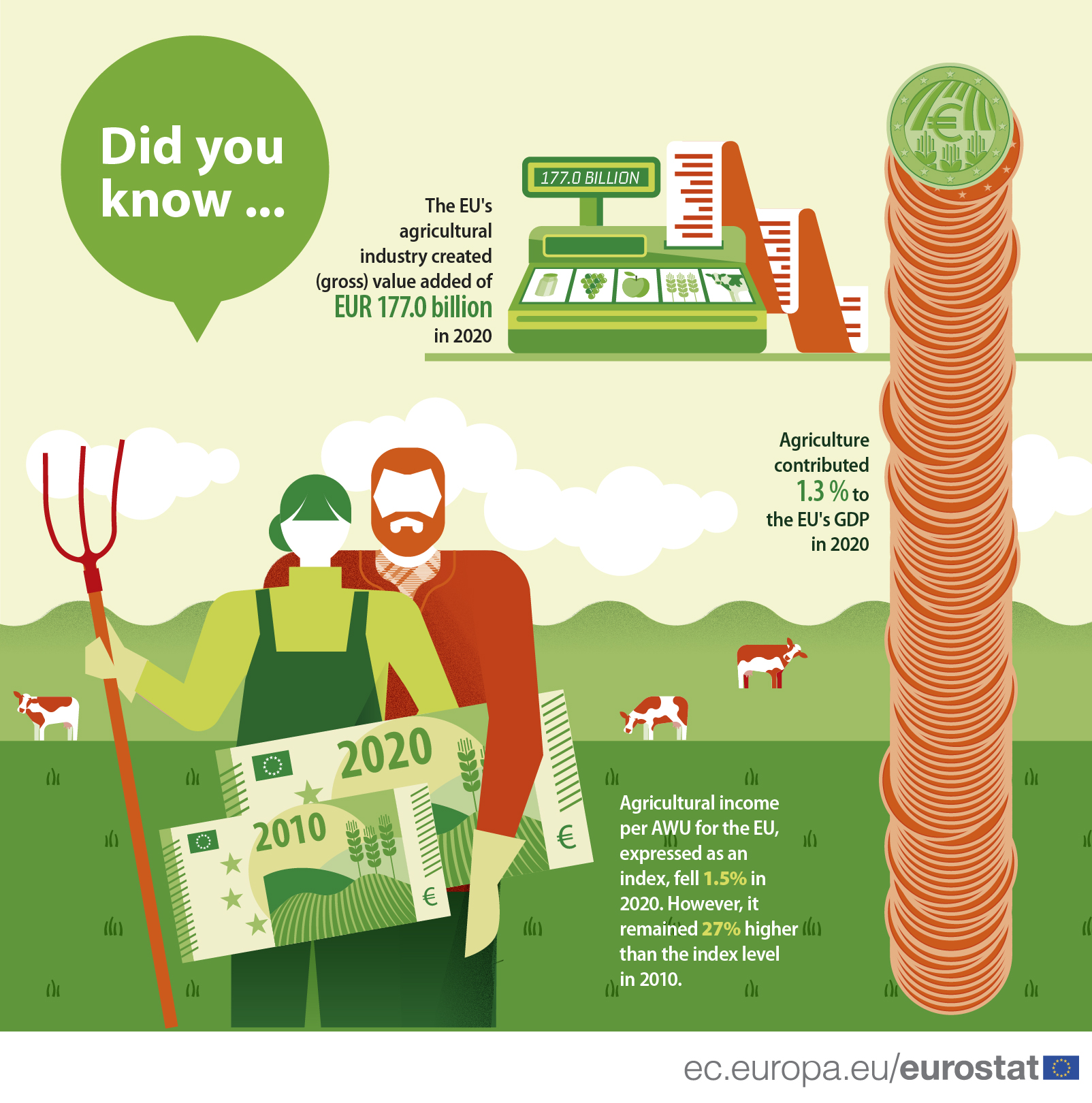 The agricultural industry in the EU created an estimated gross value added of EUR 177.0 billion in 2020. One way of looking at this is that for every 1 euro spent on the cost of goods and services used in the production process, the farms in the EU created added value of EUR 0.75.