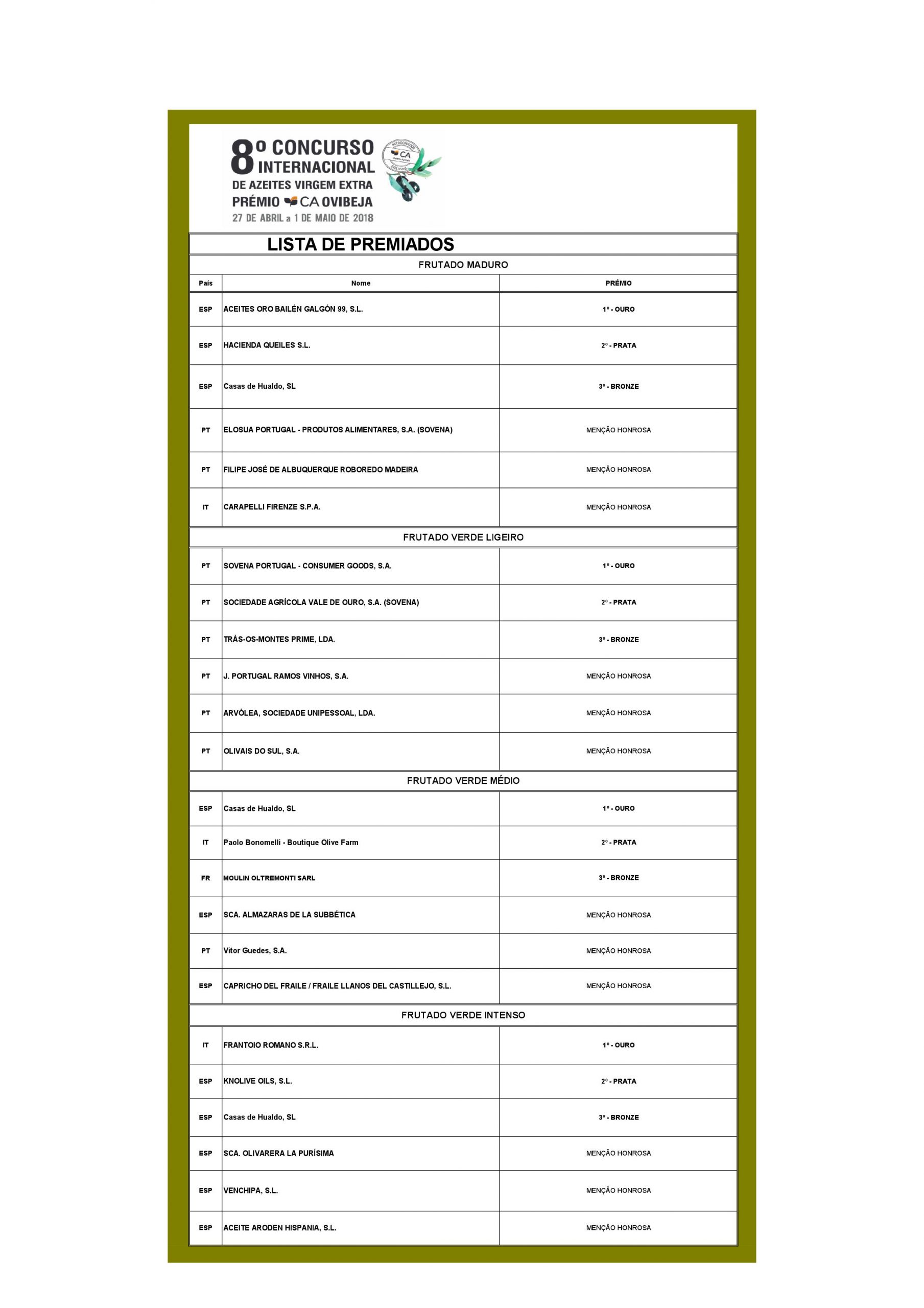 No 8º Concurso Internacional de Azeites Virgem Extra – Prémio CA Ovibeja, Portugal arrecadou, sozinho, os três primeiros prémios e as três menções honrosas na categoria de Frutado Verde Ligeiro. Com quatro categorias em escrutínio, esta foi a única com todos os prémios para um único país revelando uma tendência da qualidade dos azeites nacionais. Os resultados, conhecidos hoje à hora do almoço, dão conta de 9 prémios para Portugal e 11 para Espanha. A concurso estiveram azeites de 13 nacionalidades.
