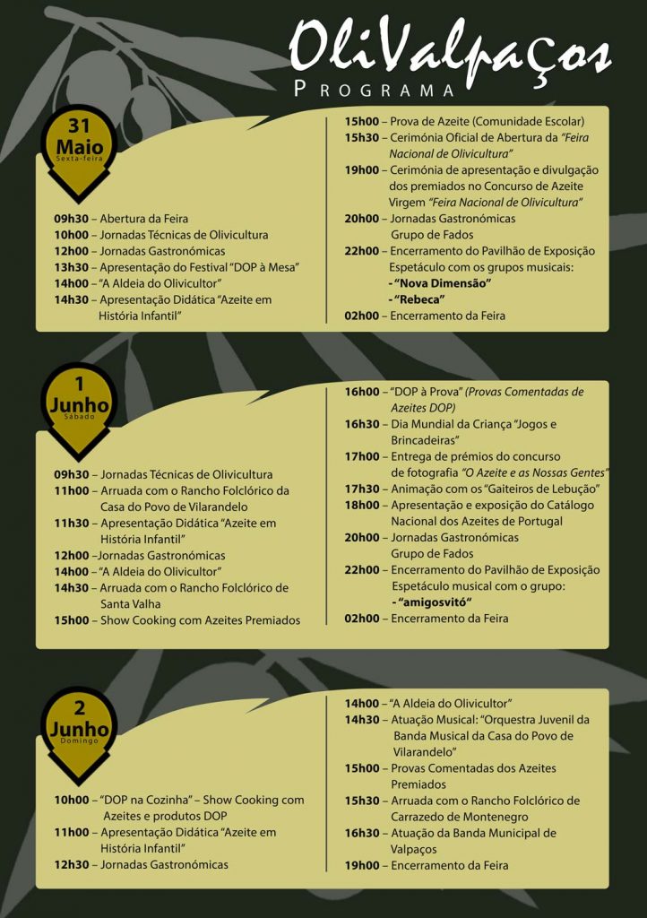 O Pavilhão Multiusos de Valpaços vai receber de 31 de Maio a 2 de Junho a OliValpaços – Feira Nacional de Olivicultura, que tem como objectivos promover e divulgar as potencialidades olivícolas, oleícolas e agro-alimentares da região e do país e que conta com o Concurso de Azeite Virgem.
