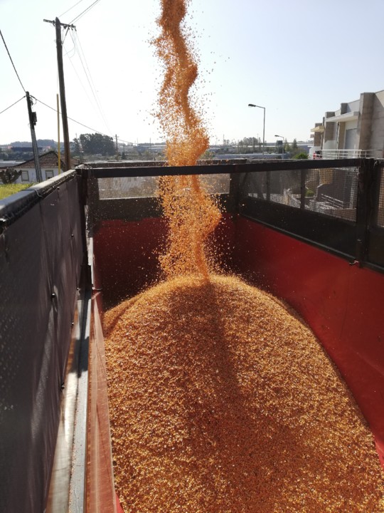 - Uma das coisas que descobri é que devia ter optado por uma variedade específica de milho grão, que sendo mais baixa seria mais fácil de colher, mais resistente ao vento e daria menos palha/restolho para processar / enterrar. Semear cedo foi importante para aproveitar as chuvas da primavera e evitar a rega, mas ainda não tinha a certeza do destino do milho, por isso optei por uma variedade de dupla aptidão. O milho já estava grande quando vi um cartaz (já fora do prazo limite de resposta) sobre a compra do milho pela União de Cooperativas; Liguei para o responsável e tive como resposta: “fica descansado, Carlos, que o milho grão que pensas produzir não chega para uma manhã da nossa laboração, nós ficamos com ele”. Não assinei, não apertei a mão, mas bastou-nos um compromisso ao telefone para ter a minha colheita encaminhada.