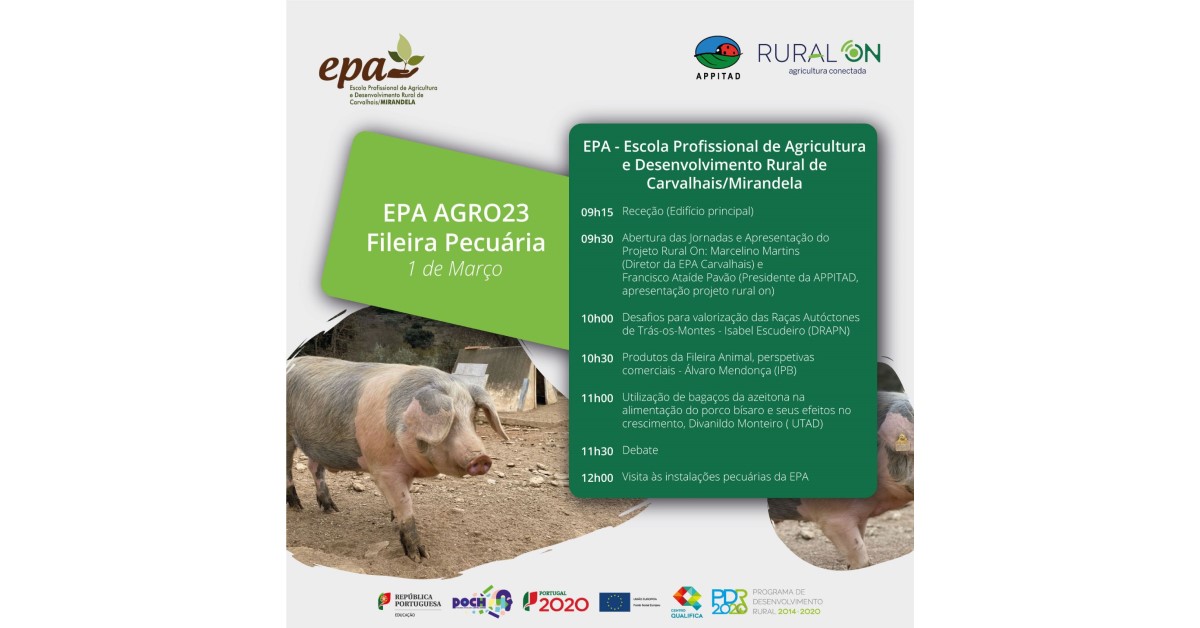 Com arranque às 9h15, o evento inclui as apresentações “Desafios para valorização das Raças Autóctones de Trás-os-Montes”, de Isabel Escudeiro (DRAP-N); “Produtos da Fileira Animal, perspetivas comerciais”, de Álvaro Mendonça (IPB) e “Utilização de bagaços da azeitona na alimentação do porco bísaro e seus efeitos no crescimento”, de Divanildo Monteiro (UTAD).