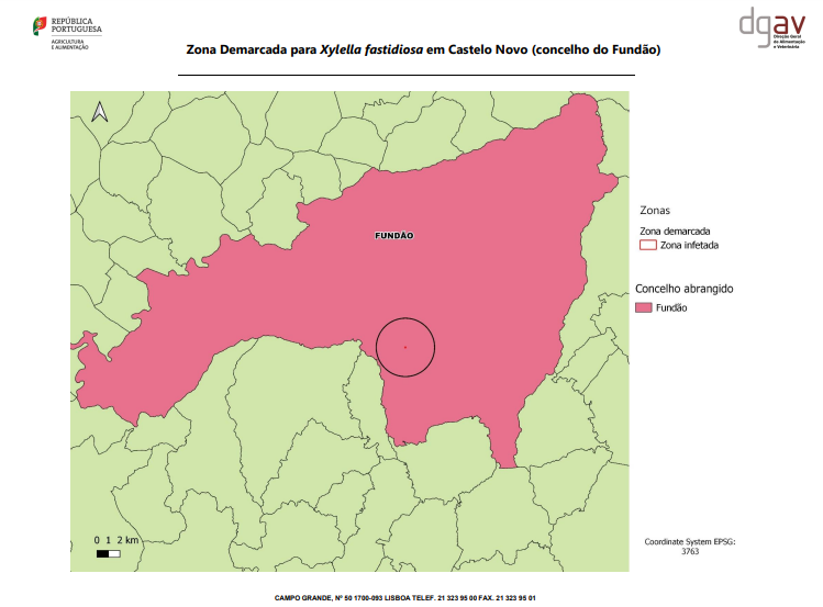 Assim, a presença da bactéria Xylella fastidiosa foi laboratorialmente confirmada numa amostra de Vitis vinifera, colhida na freguesia Castelo Novo, concelho do Fundão. A subespécie da bactéria foi identificada como sendo Xylella fastidiosa subsp. fastidiosa.