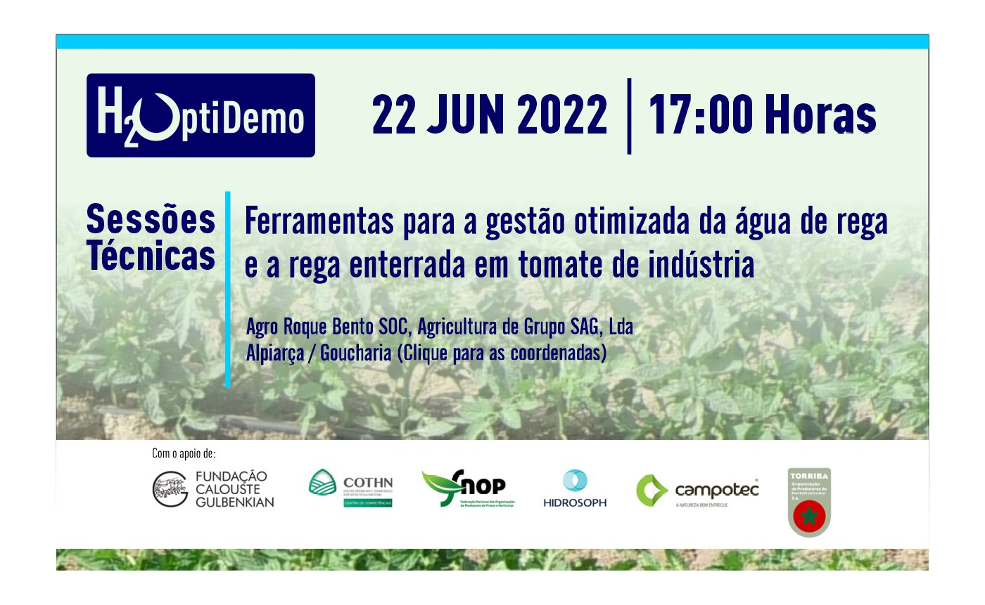 A 1ª Sessão Técnica no âmbito do projeto H2OptiDemo vai-se realizar no próximo dia 22 de junho, na Agro Roque Bento SOC, Agricultura de Grupo SAG, Lda, a partir das 17 horas.