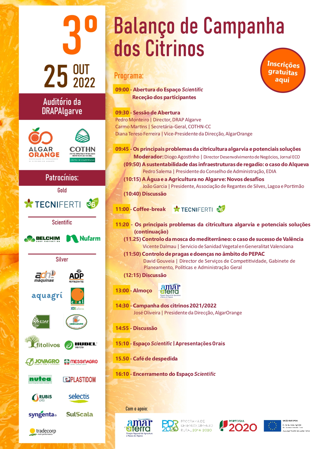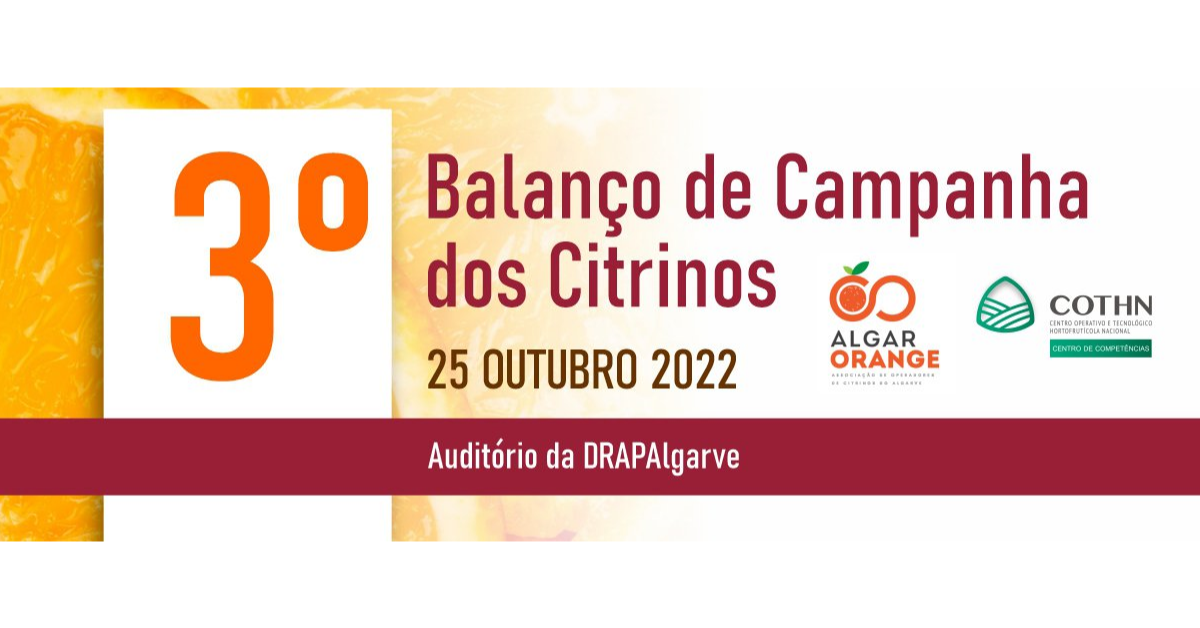 A AlgarOrange (Associação de Operadores de Citrinos do Algarve) e o COTHN-CC (Centro Operativo Tecnológico Hortofrutícola Nacional – Centro de Competências), vai realizar no dia 25 de Outubro, o 3º Balanço da Campanha dos Citrinos no auditório da Direção regional de Agricultura e Pescas do Algarve, com o objetivo de promover um amplo espaço de debate sobre temáticas fundamentais para o futuro da Citricultura da região do Algarve e simultaneamente promover a divulgação científica e tecnológica, capaz de contribuir para o lançamento de novas estratégias de inovação e competitividade, indispensáveis para a modernização e o desenvolvimento desta fileira.