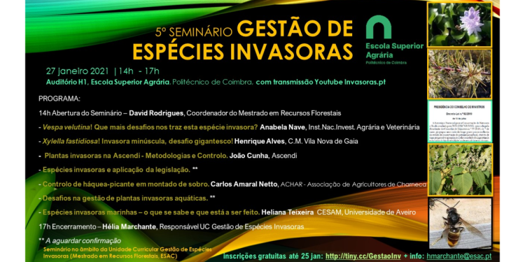 O 5.º Seminário “Gestão de Espécies Invasoras” tem lugar no dia 27 de janeiro de 2023, das 14h00 às 17h00, presencialmente (ESAC – Auditório H1) e online (Youtube Invasoras.pt).