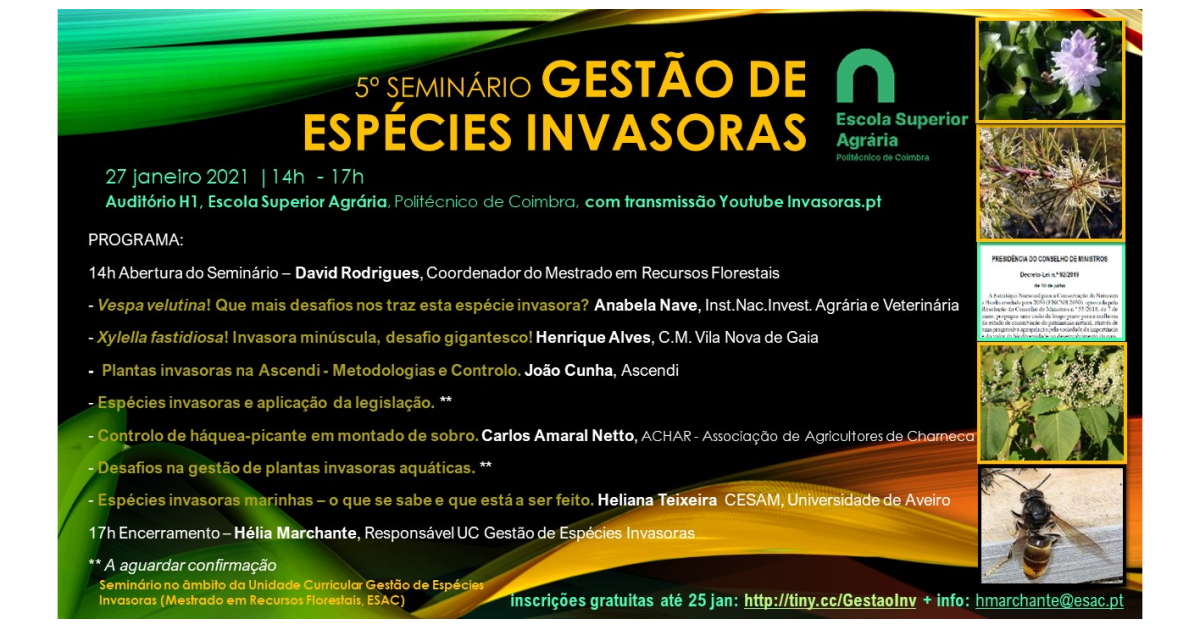 Este seminário realiza-se no âmbito da unidade curricular de Gestão de Espécies Invasoras do Mestrado em Recursos Florestais da ESAC.
