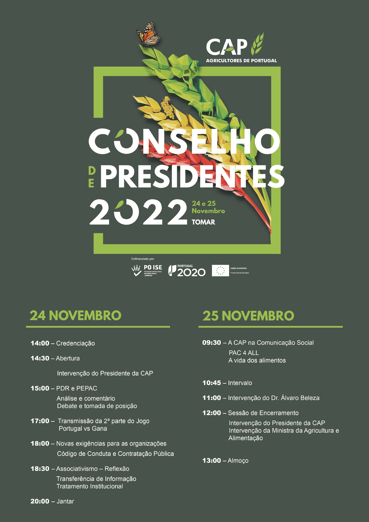 Este Conselho de Presidentes marca o 47º aniversário da CAP, fundada em 25 de novembro de 1975, a partir de um movimento espontâneo dos Agricultores Portugueses. Como organização socioprofissional agrícola, agrupa cerca de 250 organizações de todo o país, as quais se traduzem em Federações, Adegas, Associações Regionais, Associações Especializadas e Cooperativas. Desde 1977 que tem o estatuto de Parceiro Social no Conselho Económico e Social e integra a Comissão Permanente de Concertação Social. Desde 1986 tem assumido a representação de Portugal junto da Comissão Europeia, em Bruxelas, onde mantém uma delegação permanente, sendo membro do COPA, organização de cúpula das Organizações Agrícolas da UE.