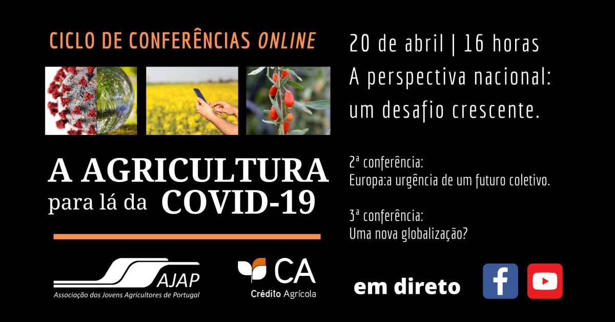 A AJAP – Associação dos Jovens Agricultores de Portugal, em parceria com o Crédito Agrícola, vai promover o ciclo de conferências online “Agricultura para lá da COVID-19”, de reflexão e discussão sobre os desafios do novo coronavírus para o setor e formas de os ultrapassar. A primeira conferência decorre já na próxima segunda-feira, dia 20 de abril.
