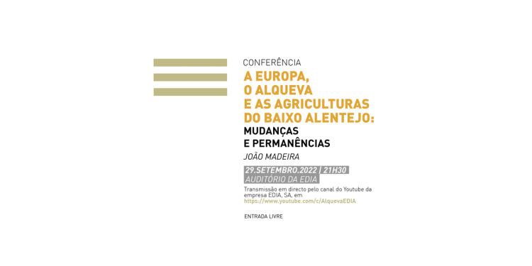 Realiza-se no próximo dia 29 de setembro, pelas 21h30, no auditório da EDIA, em Beja, a conferência “A Europa, o Alqueva e as agriculturas do Baixo Alentejo, mudanças e permanências”.