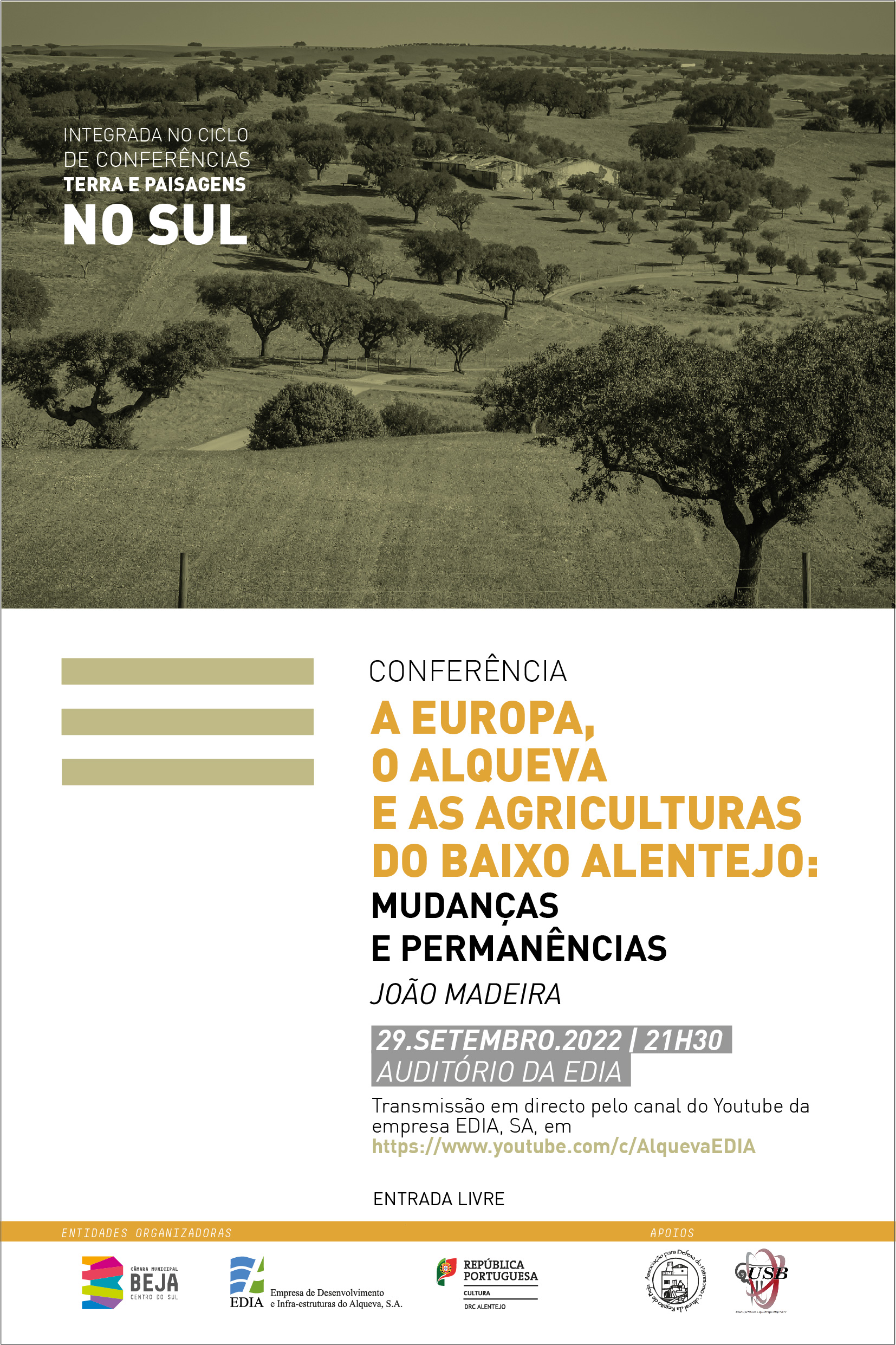 Esta conferência tem entrada livre e está integrada no ciclo “Terra e Paisagens no Sul”, que resulta de uma parceria entre a EDIA, a Câmara Municipal de Beja e a Direção Regional de Cultura do Alentejo e terá como orador João Madeira, Mestre em Economia Agrária e Sociologia Rural.