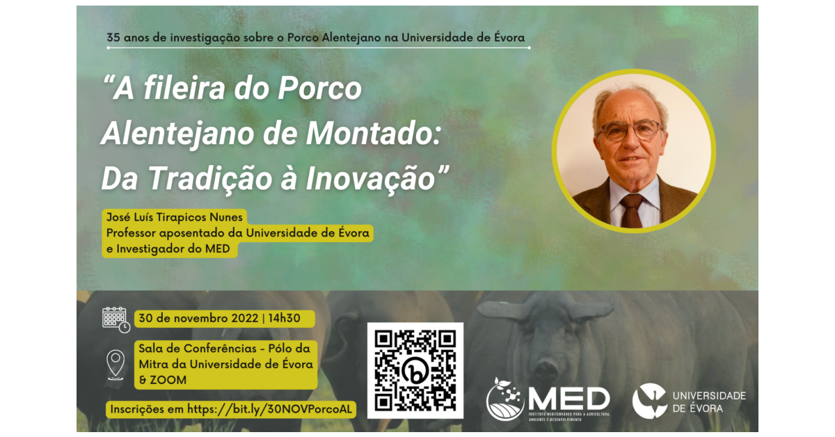 Para assinalar os 35 anos de investigação sobre o Porco Alentejano na Universidade de Évora, José Luís Tirapicos Nunes, professor aposentado da mesma universidade e investigador do MED – Instituto Mediterrâneo para a Agricultura, Ambiente e Desenvolvimento, regressa à academia alentejana para proferir a palestra intitulada “A fileira do Porco Alentejano de Montado. Da Tradição à Inovação”. O evento irá decorrer no próximo dia 30 de novembro pelas 14h30 na Sala de Conferências do Pólo da Mitra da Universidade de Évora ou online, por Zoom.