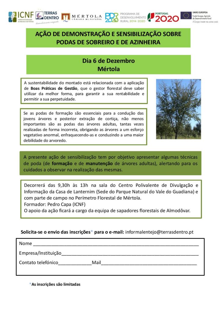 Duas ações de demonstração, sensibilização e formação dedicada às técnicas de poda (formação e manutenção de árvores adultas), nomeadamente do sobreiro e da azinheira. Uma terá lugar em Mértola e a outra em Barrancos. As duas realizam-se no âmbito do Projeto Life Montado-Adapt. Seguem, em anexo, dois cartazes.