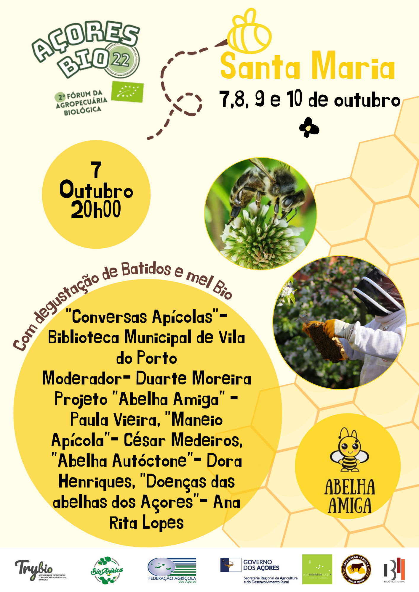Pelas 20h00 hoje decorrerá na Biblioteca Municipal de Vila do Porto as “Conversas Apícolas”, com os seguintes oradores: Dora Henriques – “Abelha Autóctone” e Ana Rita Lopes– “Doenças das abelhas dos Açores”, ambas do Instituto Politécnico de Bragança, César Medeiros – “Maneio apícola”, apicultor e colaborador da Cáritas da Ilha Terceira e Paula Vieira – Projeto “Abelha Amiga”, da Direção Regional de Agricultura. Esta iniciativa terá início com um momento de degustação de batidos e mel bio, para todos os participantes.