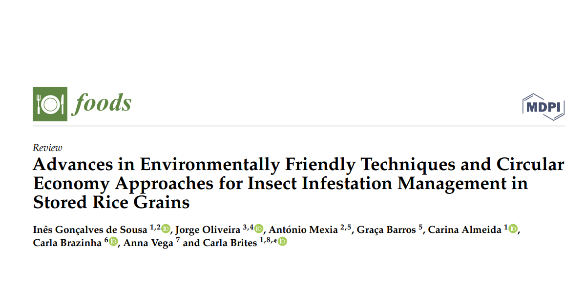 Rice (Oryza sativa L.) is a staple food for about half of the world’s population. Therefore, it is important to search for solutions that minimise losses and production costs for producers and ensure food quality and safety for consumers. Improved methods for the detection and monitoring of hidden infestations are useful for adopting infestation control measures. Chemical methods are used to prevent rice losses due to infestations; changing this situation, however, is of the utmost importance, as it harms the environment and human health. The management of infestation by controlled storage conditions, namely temperature and atmosphere composition and the use of current fossil-based packaging with modified atmospheres, is well recognised. The use of environmentally friendly solutions is promising, but it is necessary to perform a life-cycle assessment and cost analysis to evaluate their effectiveness. According to the principles of circular economy, the integration of the best-selected treatments/solutions for insect management, along with the use of biopackaging from rice by-products are recommended. This review describes the methods of detection and control of infestation as well as several promising alternatives to chemical treatments; however, more research is needed in order to obtain effective technological solutions that can be applied at an industrial scale.