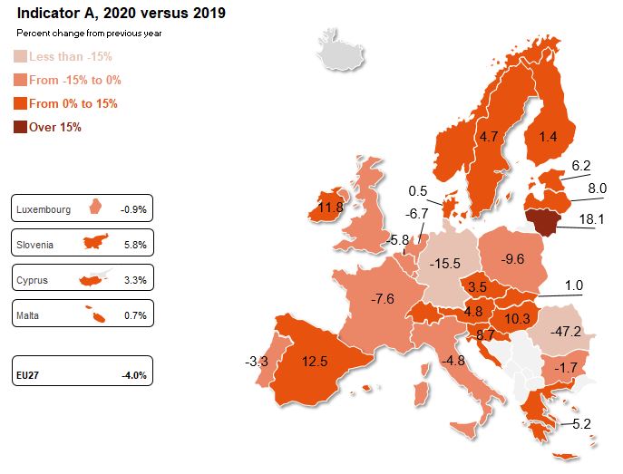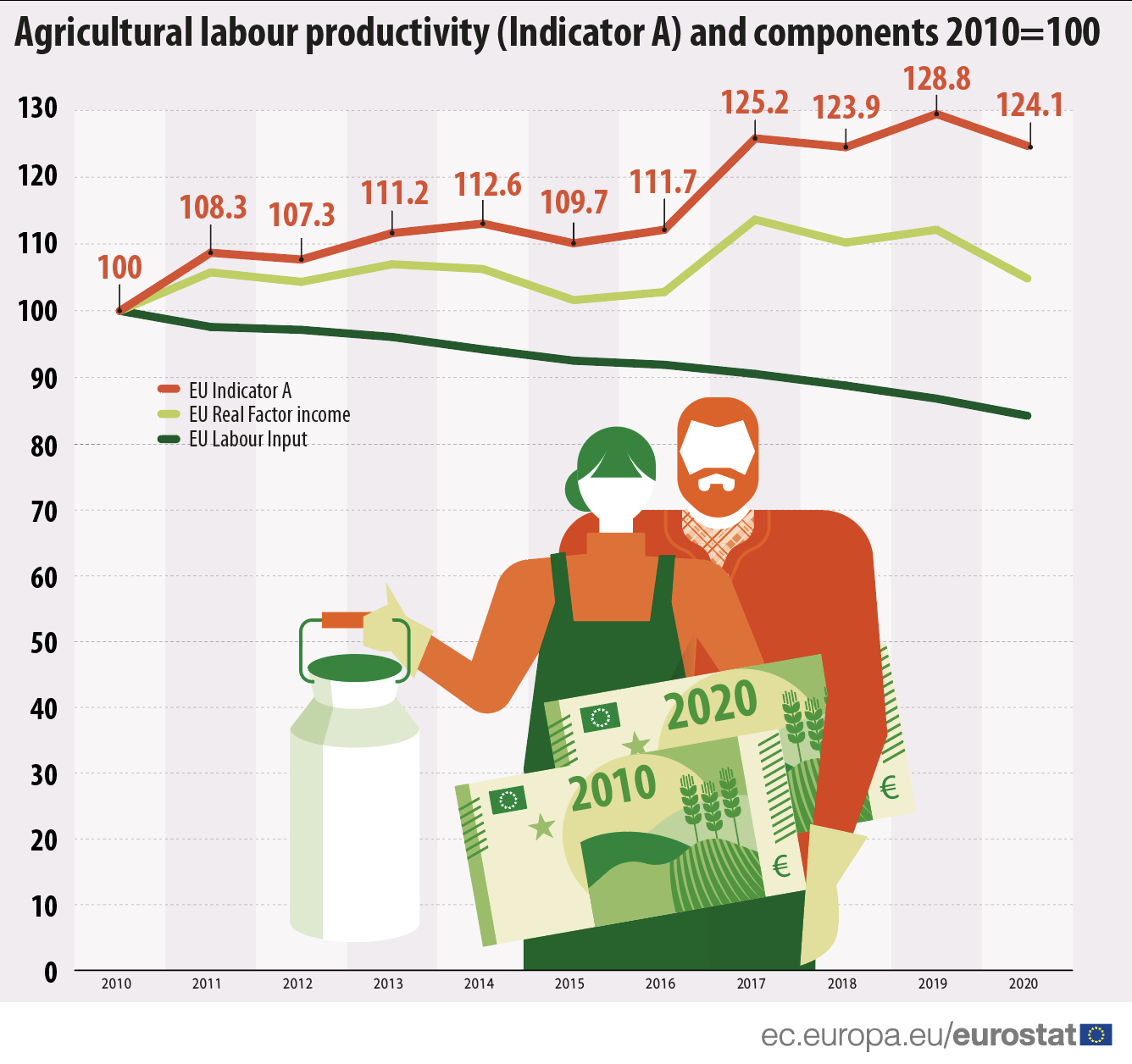 According to the latest data of economic accounts for agriculture (EAA), the index for agricultural labour productivity is estimated to have decreased in the European Union of 27 Member States (EU) in 2020 (-4%), after an increase in 2019. In addition to weather conditions, which normally affect agricultural production, this is also against the backdrop of the current pandemic.