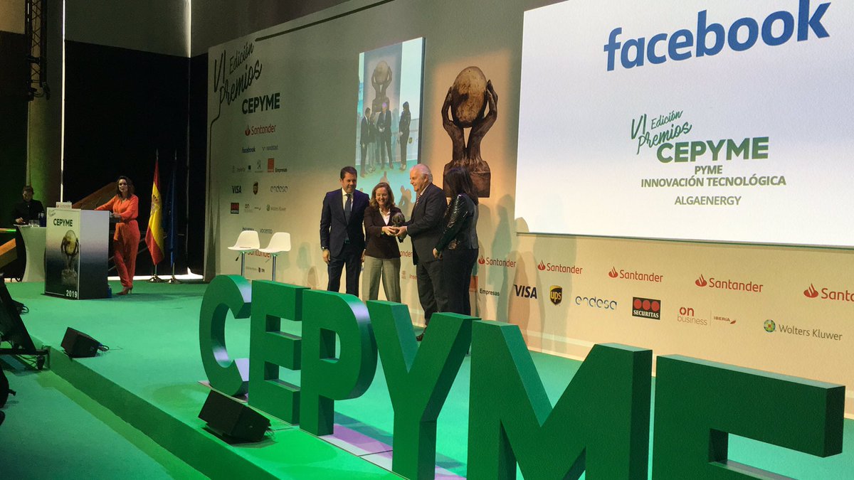 A AlgaEnergy acrescenta mais um sucesso à sua longa lista de reconhecimentos públicos depois de a Confederação Espanhola das Pequenas e Médias Empresas (CEPYME) lhe atribuir o Prémio CEPYME 2019 na categoria de Inovação Tecnológica. Os Prémios CEPYME, que reconhecem as realizações das pequenas e médias empresas e a sua contribuição para o progresso económico e social e para a criação de emprego em Espanha. A apresentação desta VI edição teve lugar no dia 6 de novembro, em Madrid.