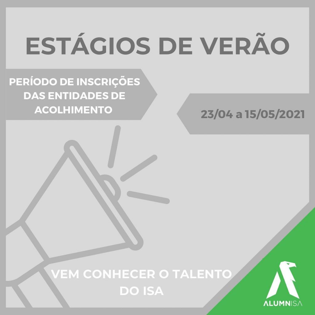 A alumnISA – associação alumni do Instituto Superior de Agronomia lançou, na passada sexta-feira, dia 23 de abril, o programa de Estágios de Verão 2021. Este programa visa proporcionar aos alunos do Instituto Superior de Agronomia (ISA) uma experiência em contexto de trabalho, durante as pausas letivas e férias curriculares. Para os alunos, é uma ótima oportunidade para expandir o conhecimento fora da Universidade, e para crescer pessoal e profissionalmente.