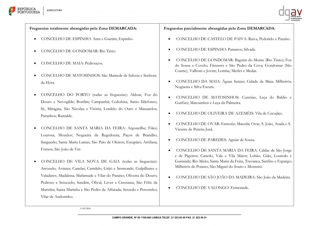 - Procede-se à delimitação da zona demarcada para Xylella fastidiosa, encontrando-se em anexo o respetivo mapa, bem como, a lista das freguesias totalmente e das parcialmente abrangidas por esta zona demarcada, também disponível na página electrónica da DGAV1;