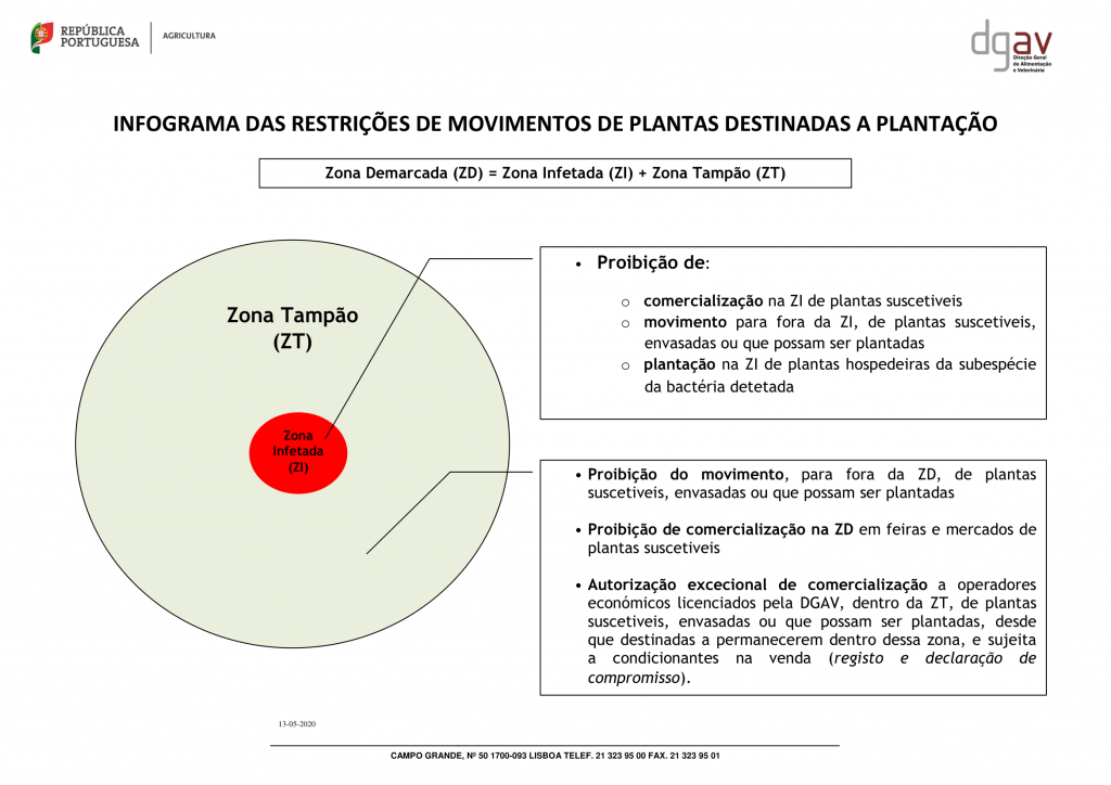 - Proibição do movimento para fora da zona demarcada e das zonas infetadas para a zona tampão de qualquer vegetal, destinado a plantação, com excepção de sementes, pertencente aos géneros e espécies constantes da “Lista de Géneros e Espécies sujeitos a Restrições Fitossanitárias” disponível na página eletrónica da DGAV;