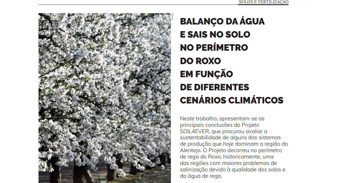 Neste trabalho, apresentam-se as principais conclusões do Projeto SOIL4EVER, que procurou avaliar a sustentabilidade de alguns dos sistemas de produção que hoje dominam a região do Alentejo. O Projeto decorreu no perímetro de rega do Roxo, historicamente, uma das regiões com maiores problemas de salinização devido à qualidade dos solos e da água de rega.